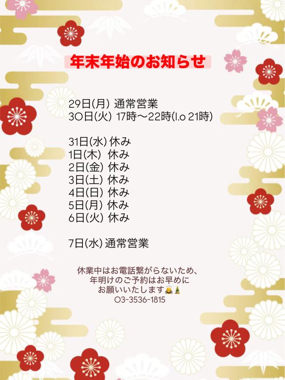 12月28日(土)ー1月5日(日)お休みをいただきます。 お休み中はお電話繋がらないため、年明けのご予約はお早めにお願いいたします。